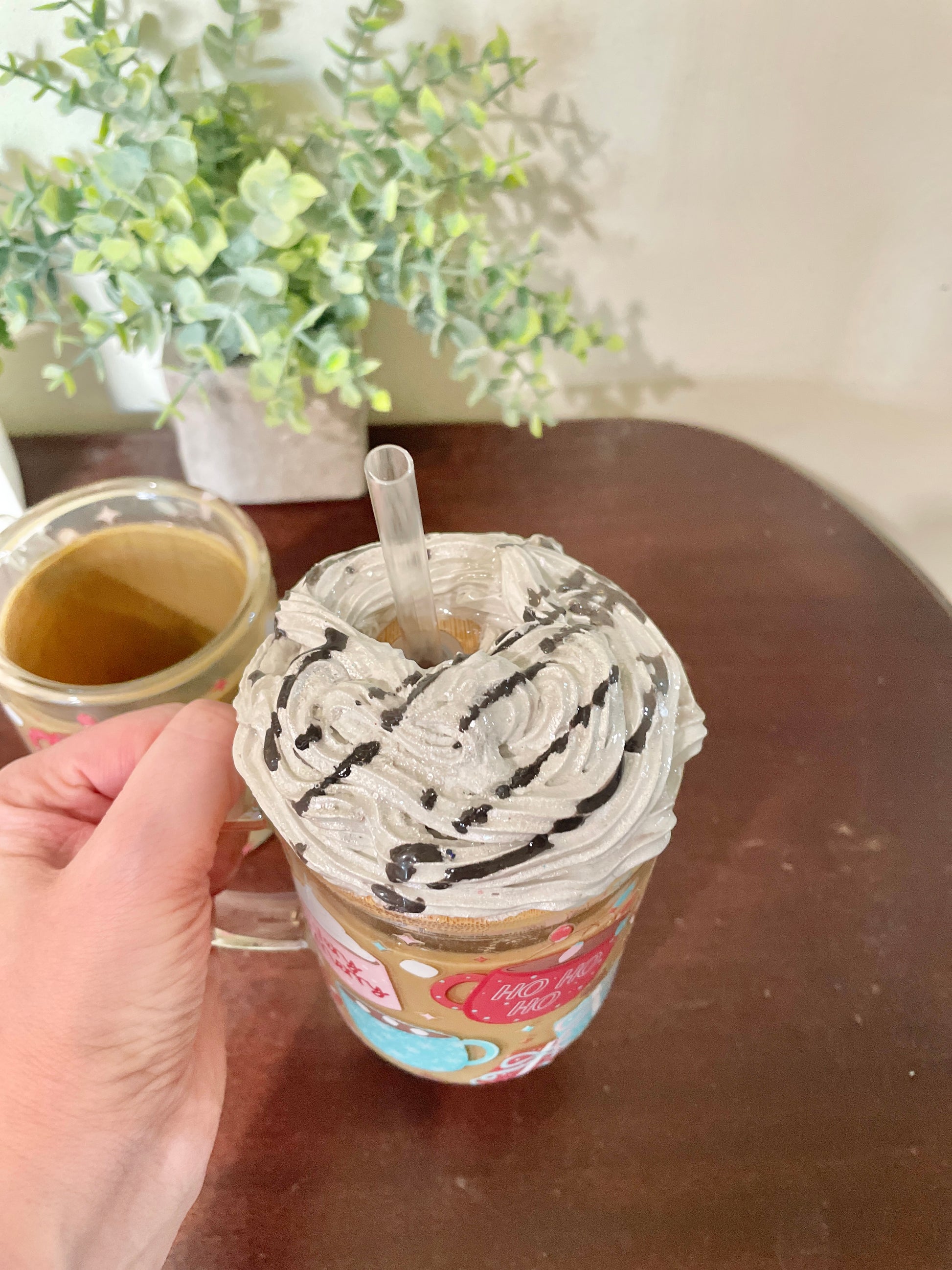 This mug features a filled hollow wall design that creates the look of it being full. The top is a resin based “whipped cream” that creates a solid lid with straw access.